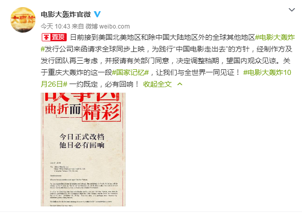 其微博称:日前接到美国北美地区和除中国大陆地区外的全球其他地区#电影大轰炸#发行公司来函请求全球同步上映,为践行“中国电影走出去”的方针,经制作方及发行团队再三考虑,并报请有关部门同意,决定调整档期。