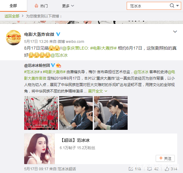 此前,《大轰炸》影方陷入“洗钱”风波,曾在北京召开说明会回应此事。如今,其官微宣布改档至10月26日,而在该片最新曝光的“炸弹”版海报中,范冰冰的名字从海报中的演员名单及通稿文案中“消失”。成都商报记者从《大轰炸》的官方微博中看到,目前只有一条和范冰冰相关的消息。