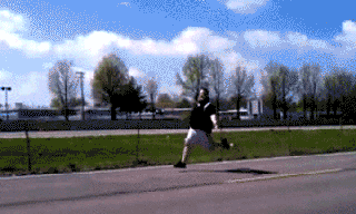 这位大哥跑得速度太快了,有点刹不住车,最后直接在地上翻滚了一圈接着站起来了,这“功夫”让我佩服,不过看起来好想笑啊,哈哈!