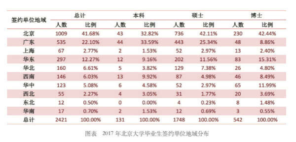 以2017年为例,北京大学本部本科毕业生2645人,75.16%人选择在国内外深造,签约就业、灵活就业共606人,其中与用人单位签订三方协议的有131人,工作地点在北京的有43人,在广东的有44人,在上海的仅有2人。清华大学2017年本科毕业生3119人,深造比例81.9%,签三方就业人数147,其中北京占21.1%,约为31人;上海占4.1%,有6人。