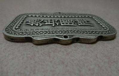 这个银块就是清朝时期的一块总兵腰牌,除了质地是纯银之外,上面还有作为将军调兵的凭证用的花纹和防伪标识。了解历史的都知道,总兵制度从明朝开始,而总兵这个官职在明朝是空职,在清朝开始掌握实权,所以从这个时候开始与总兵这个职位有关的一切也变得重要起来。这块银牌就是清朝末年的一位总兵用于统领大军的腰牌,只要有了腰牌就可以号召几万人。