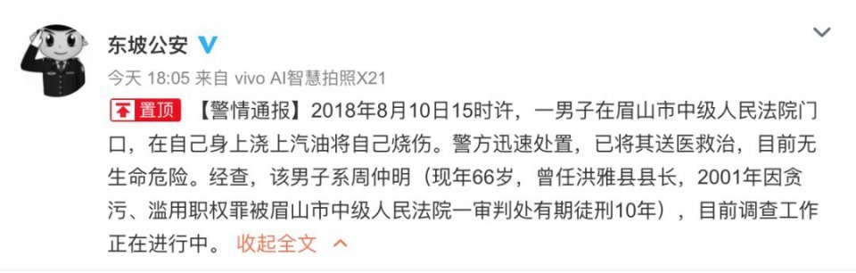 四川省眉山市公安局东坡区分局发布消息:2018年8月10日15时许,一男子在眉山市中级人民法院门口,在自己身上浇上汽油将自己烧伤。警方迅速处置,已将其送医救治,目前无生命危险。经查,该男子系周仲明(现年66岁,曾任洪雅县县长,2001年因贪污、滥用职权罪被眉山市中级人民法院一审判处有期徒刑10年),目前调查工作正在进行中。