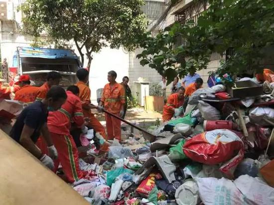 为了帮助清运垃圾,8月8日,塘南社区出动了15位清洁工、6名保安、6名社工,20多人整整忙活了一天。