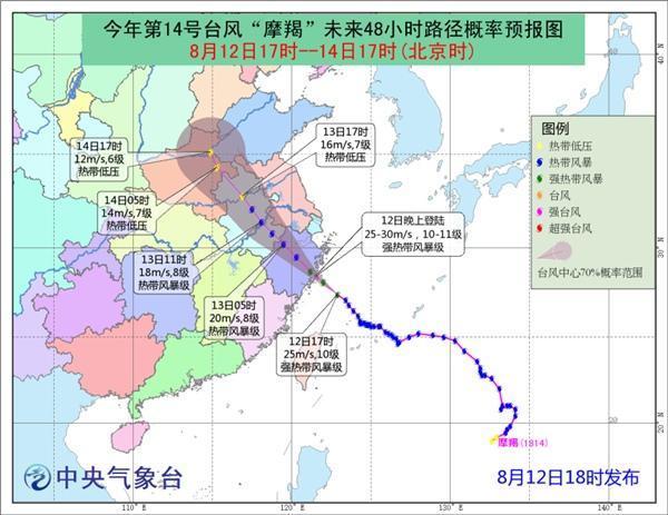 据中央气象台消息,今年第14号强热带风暴“摩羯”12日19时位于台州市温岭东南约135公里的洋面上,风速25米/秒,气压985百帕,近中心最大风力10级,预计“摩羯”将以每小时35公里的速度向西北方向移动,强度将有所加强,并逐渐向浙江沿海靠近,预计将于于今天夜里在瑞安到三门一带沿海登陆。