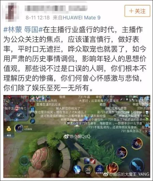 根据网友口述,8月11日上午11点左右,拥有百万关注的斗鱼主播林蒙一边打王者荣耀,一边假装打电话吹牛,说自己兄弟在731部队当营长。