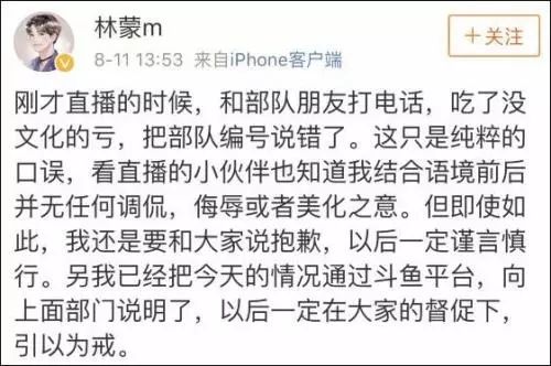 今天下午,林蒙在自己微博上道歉,说自己吃了没文化的亏,说错部队编号只是纯粹的口误,并无任何调侃、侮辱或者美化之意。