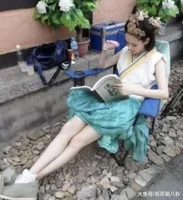 再看看这位,在片场里看书的时候。还把一双大白腿给露出来,看来这古装真的是太热了。