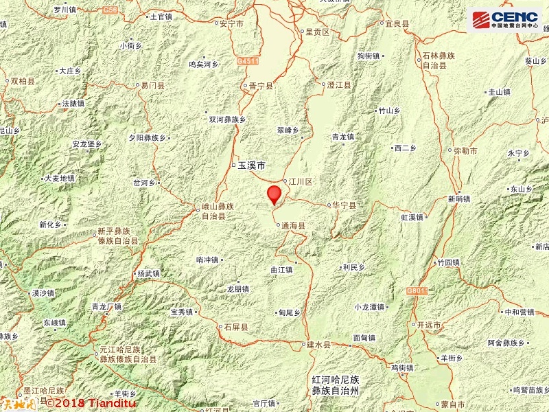 中国地震台网正式测定:08月13日01时44分在云南玉溪市通海县(北纬24.19度,东经102.71度)发生5.0级地震,震源深度7千米。