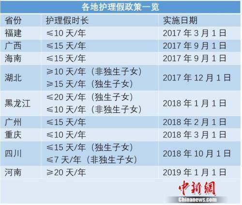 据不完全统计,近年来,福建、广西、湖北、海南、黑龙江、重庆、广州、四川、河南等至少9地,以地方立法或行政规章的形式明确了护理假。对于独生子女休假的条件各省也有所不同。