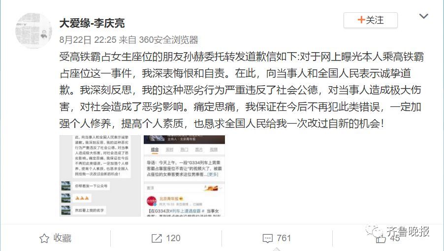 原标题:高铁“霸座”男子道歉了:当时自己态度不太好,现在很后悔