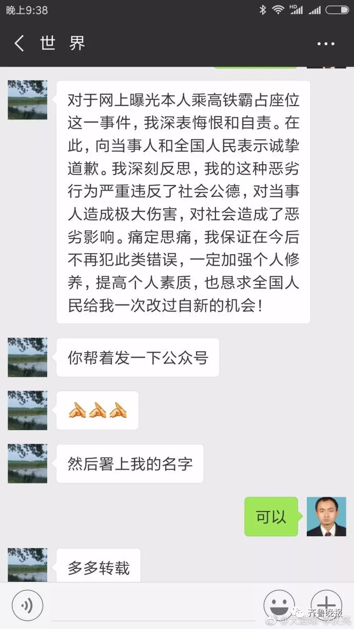 对于网上曝光本人乘高铁霸占座位这一事件,