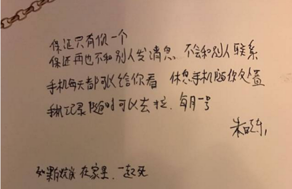 整理杨俪萍的遗物时,家人翻出一张纸条,上面是朱冬潦草的字迹:“保证只有你一个,保证再也不和别人发消息,不会和别人联系,手机每天都可以给你看,手机记录随时可以去拉,每月一号。”左下角还补上一行小字“如果有,烧炭,在家里,一起死。”