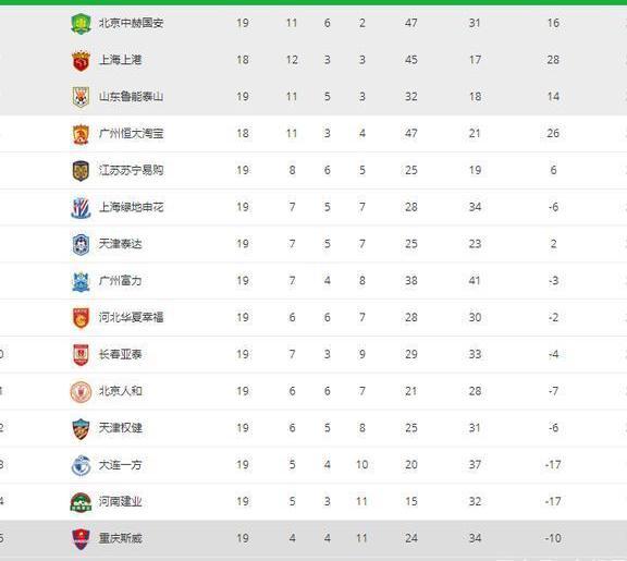 上周末贵州恒丰爆冷击败山东鲁能、大连一方击败河南建业、重庆斯威输给上海上港后,积分榜最后几支球队的积分又发生了变化。大连一方积19分、河南建业积18分、重庆斯威积16分、贵州恒丰积11分。