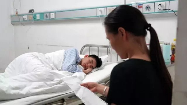 目前,因为一个不起眼的胎记而罹患恶性黑色素瘤的魏尚子还在医院救治,从确诊至今家里已经花去了十几万元的治疗费,第一个疗程还未结束。医生说因为肿瘤长在颈部大动脉上,手术风险大,只能依靠全自费的靶向药治疗,而一盒药就要 8000 多块钱,整个疗程需要 50 万元左右,但是看到尚子在吃药后,肿起的疙瘩明显变小,疗效显著,这给全家人带来了希望。“我家就这么一个独子,不管再困难,也一定要与死神赛跑,为孩子求得生存机会。”妈妈尚士先说。图为魏尚子年轻的妻子在病床前安慰他。
