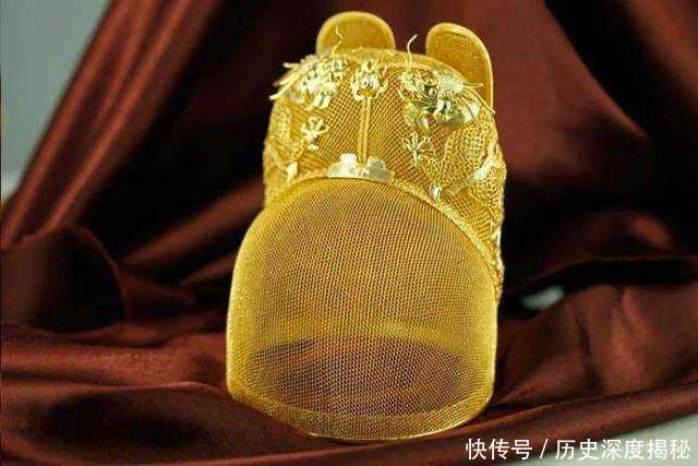 很多古装影视中皇帝都戴着黄色的帽子,其实这是毫无历史常识的,皇帝生前是不戴黄帽的,只有驾崩后才佩戴。这件出土于明十三陵万历墓的金丝蟠龙翼善冠用极细的金丝编织而成。下缘内外镶有金口,冠的后上方有两条左右对称的蟠龙于顶部汇合,两龙之间有一圆形火珠,周围喷射出火焰。