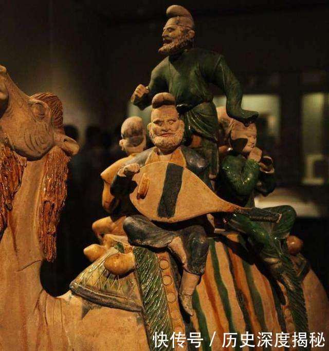 1959年出土于陕西省西安市西郊中堡村唐墓,现收藏于陕西历史博物馆,属于国家公布的第三批永久禁止出境展览的顶级文物。驼背部架一平台,铺方格纹长毯,上有乐舞俑8个,7男乐俑1女舞俑,而且三彩陶器在唐代烧造达到鼎峰时期,创造了浓艳瑰丽的唐代艺术风格。