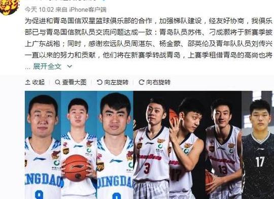 传闻已久的苏伟转会终于尘埃落定,今天广东宏远俱乐部官方媒体宣布:为促进和青岛国信双星篮球俱乐部的合作,加强梯队建设,经友好协商,我俱乐部已与青岛国信就队员交流问题达成一致:青岛队员苏伟、刁成灏将于新赛季披上广东战袍;同时,感谢宏远队员周湛东、杨金蒙、邵英伦及青年队队员刘传兴一直以来的努力和贡献,他们将在新赛季转战青岛,上赛季租借青岛的高尚也将永久转会青岛。