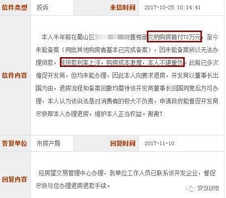 蜀山某盘大半年未能备案,导致无法办理贷款,现贷款利率上浮,购房成本激增,购房者缴纳72万的首付也要要求退房。