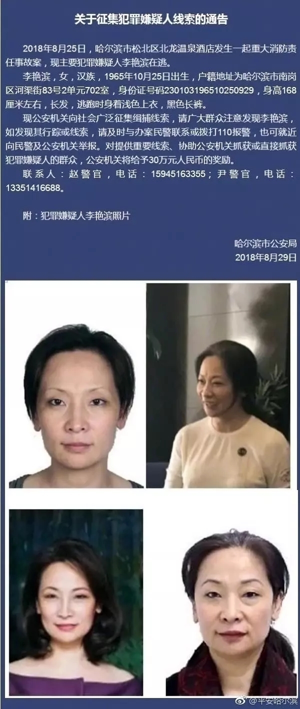 8月29日,哈尔滨市公安局发布悬赏通告,征集“8.25”哈尔滨大火的主要犯罪嫌疑人李艳滨线索。据央视新闻报道,李艳滨是事发酒店实际出资人。