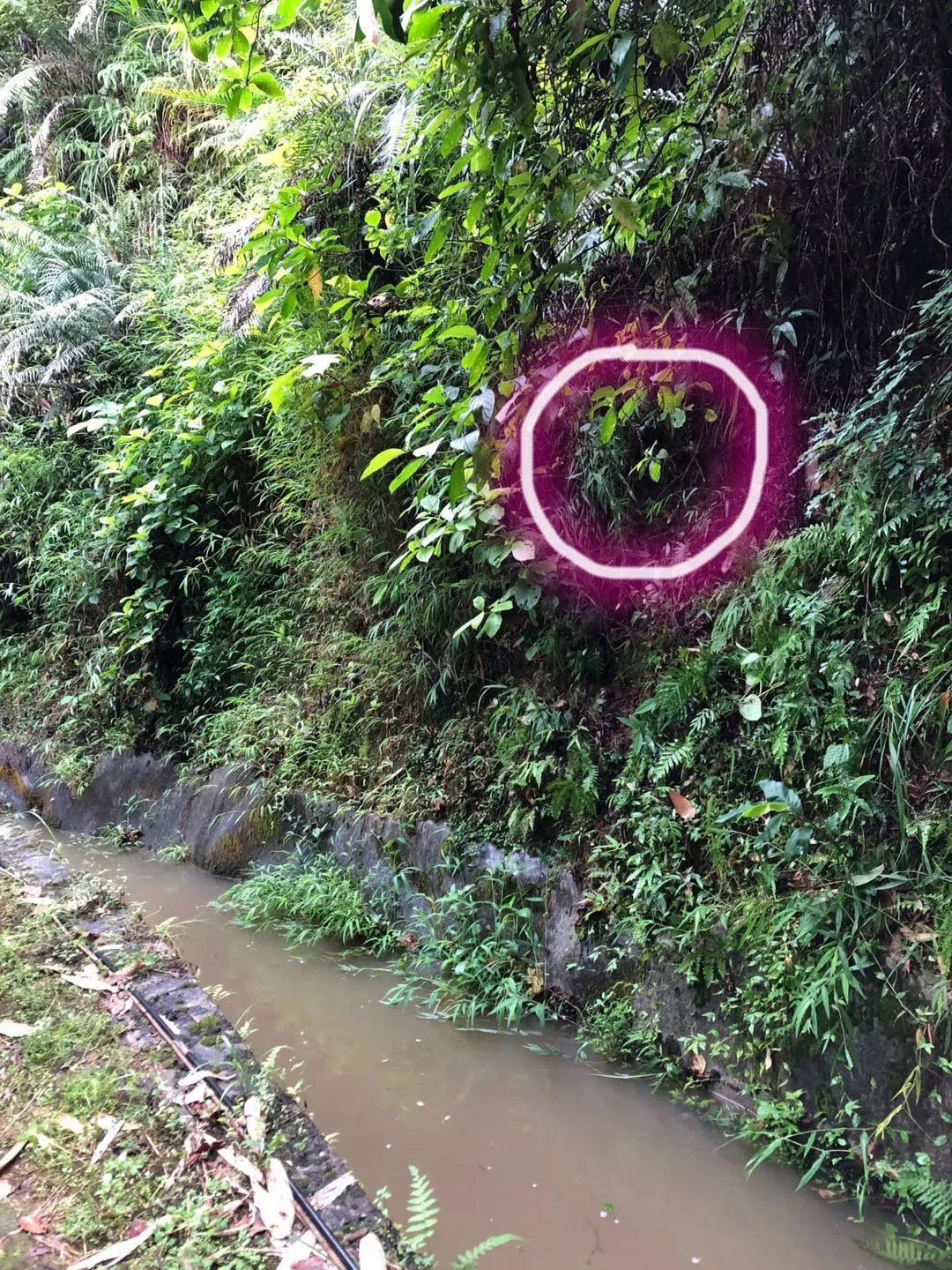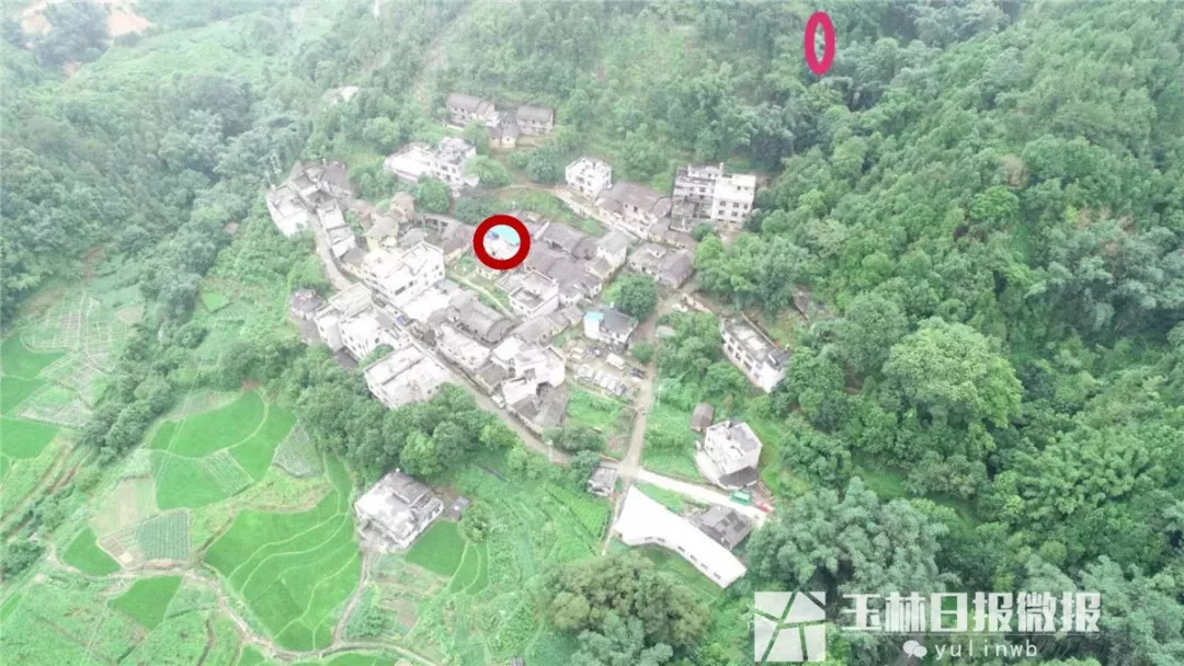 警方无人机搜寻图片,下红圈为小娇家,上红圈为失踪小娇发现地点