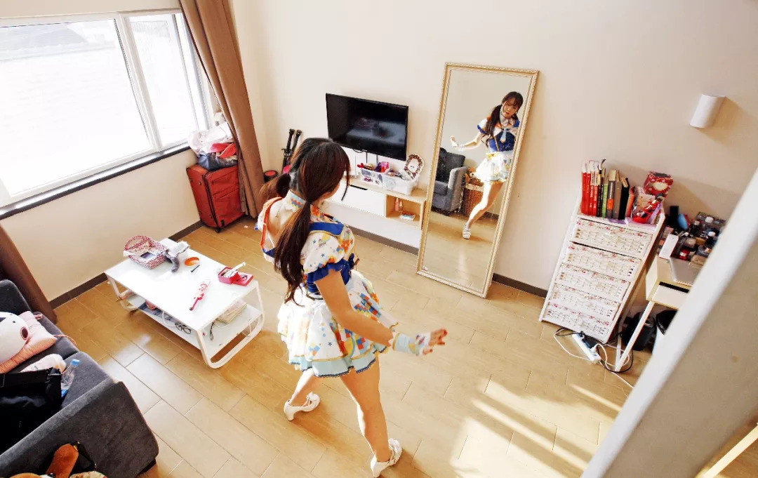 一名爱好Cosplay的房客在魔方公寓房间里练习舞蹈动作。图/新华