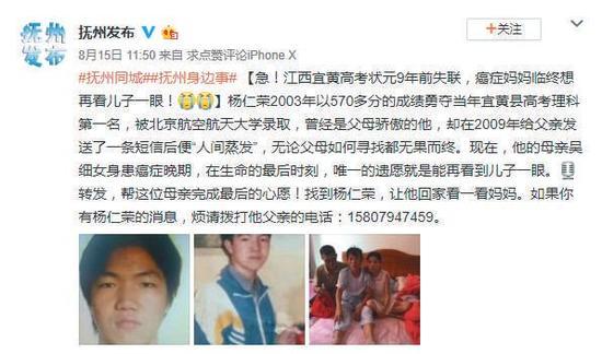 新京报记者昨日了解到,这条寻人信息要寻找的是曾为宜黄县高考理科状元的杨仁荣,9年前他突然失踪与父母失去联系。今年7月份,杨仁荣的母亲吴细女被诊断为子宫平滑肌肿瘤癌症晚期,病重的母亲希望,能够再看到儿子一眼。