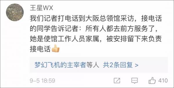 另外,北京时间记者致电大阪总领馆,接电话的人说,所有人都去前方服务了,她是使馆工作人员家属,被安排留下来负责接电话。
