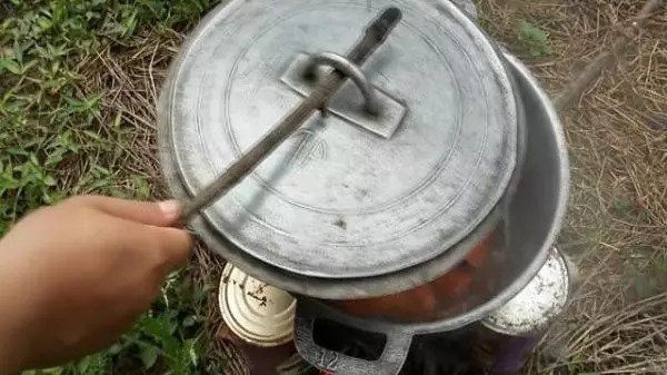 他在处理好这4个螃蟹之外 ,没有用水直接煮,而是在这个锅底下倒上了2斤的食盐,然后把螃蟹摆放在食盐上面,再放到炉子上去煮了。而且锅里没有放一点水。