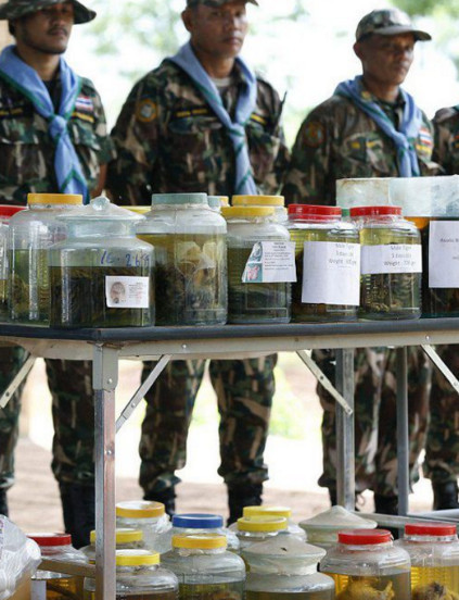 交易的人共有22人,其中包括因交易虎皮被抓的僧人。查获的所有罐子。在寺庙中被困住的老虎。