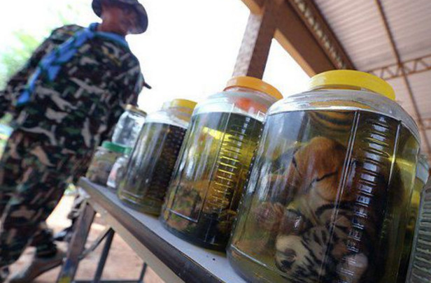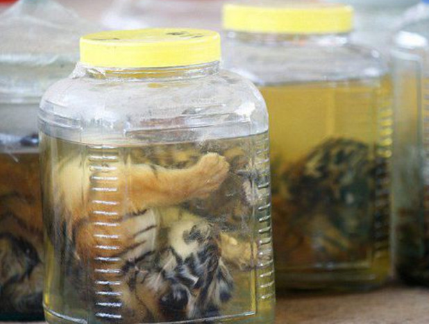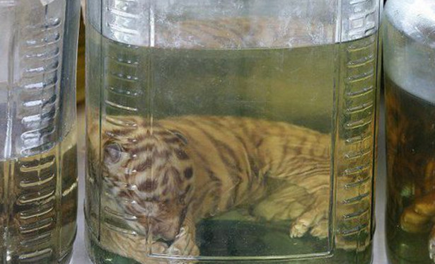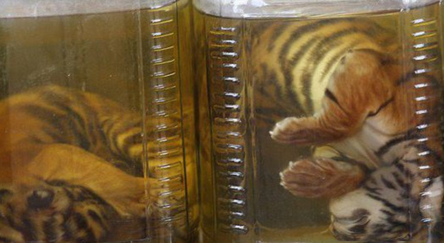 他们在这家寺庙里搜出了多达四十只老虎尸体,还有一些动物角。这些小老虎都用罐子泡着。在寺庙里还有很多虎身上的虎皮、虎骨、虎鞭等等,还有熊、豹子、鹿身上的各种器官。涉及这些非法