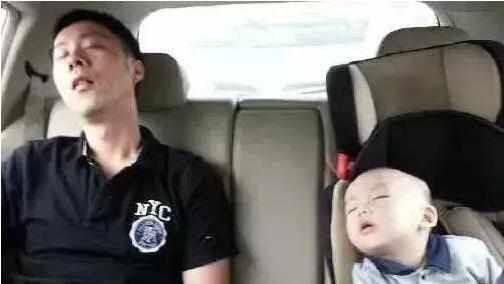 这位宝爸和宝宝也是在车上就睡着了,而且都是头朝着天,长着嘴,呼呼大睡,不知道有没有流口水呢?