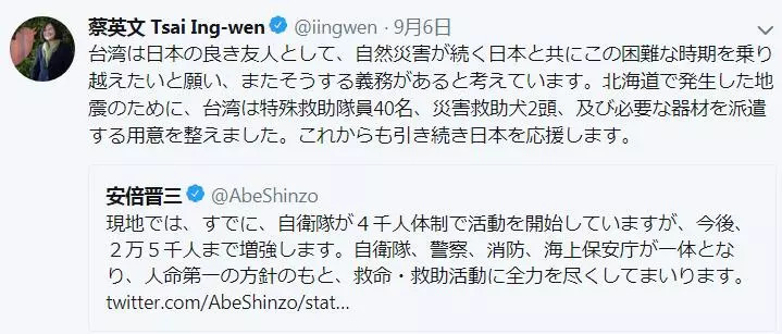 6日,蔡英文又用日语回复安倍晋三的推特,在日本连续遭受自然灾害的艰难时期,台湾作为日本的友人有“义务”并期望协助日本度过难关,准备派遣40名特种救援人员,还两只救灾犬和必要的设备。她还说,台湾未来也会继续援助日本。