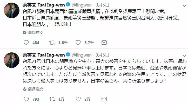 蔡英文5日发文慰问日本台风受灾民众。(推特截图)