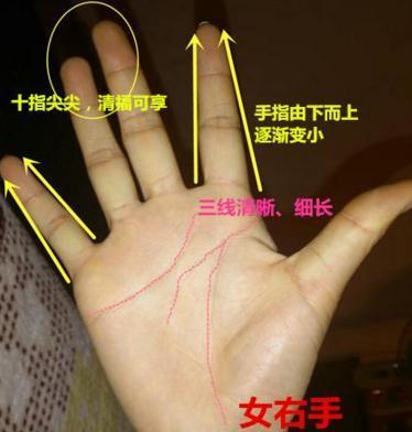 本年30多岁的女士把手保养得很好,必定不是干粗活的手相。三线清楚而颀长,代表运势较好,没有若干好多烦苦衷,概况上弱质纤纤,实则安康、聪明。青翠手指,由下而上渐渐变小、变尖,形成十指尖尖的名目,清福可享,生平都不会辛劳、奔波,有人疼爱,注定是好命女人的手相