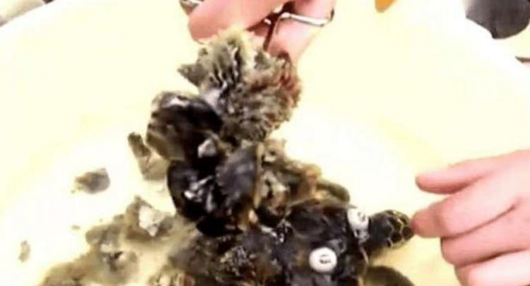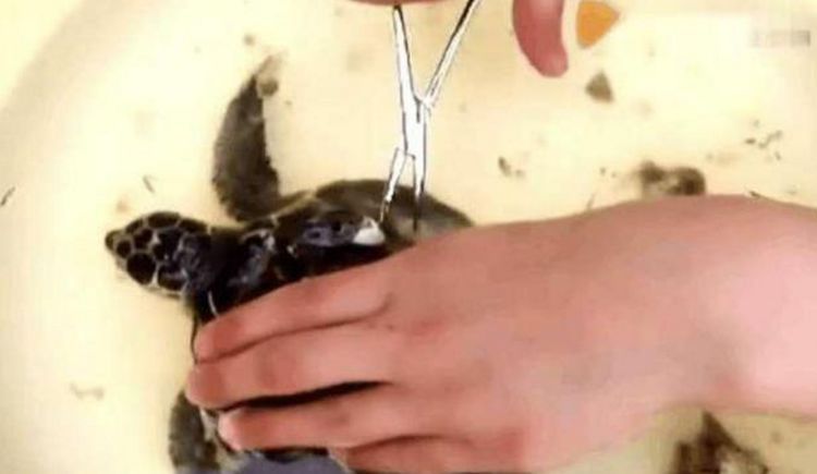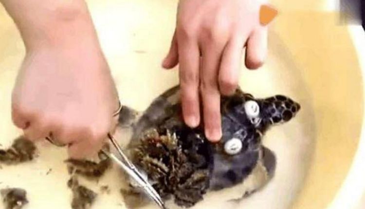 随后又用酒精将寄生物寄生的地方清洗了一遍,中间换了好几次水,最终,清理干净的小海龟就出现在我们的视线啦。不得不说,没有了寄生物,我们的小海龟还是很英俊的。