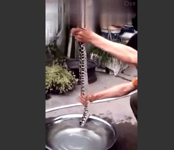 贵州的人靠山吃山,山里有蛇当然也免不了蛇酒这一说。当地的男子抓到这条蛇后,抓住蛇头和蛇尾,简单清洗了蛇身后,直接就拿了一个装了白酒的坛子,没有把蛇弄死,直接活生生的把蛇放进坛子里,蛇挣扎,可是怎么也挣脱不了人类的力气,最终被放进了坛子里。