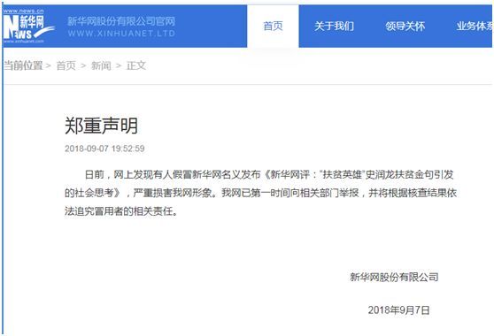 9月7日晚,新华网发布一份《郑重声明》:网上发现有人假冒新华网名义发布《新华网评:“扶贫英雄”史润龙扶贫金句引发的社会思考》,严重损害我网形象。我网已第一时间向相关部门举报,并将根据核查结果依法追究冒用者的相关责任。