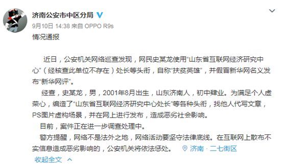 9月10日,济南警方通报了最新的核查情况:史某龙,男,2001年8月出生,山东济南人,初中肄业。为满足个人虚荣心,编造了‘山东省互联网经济研究中心处长’等各种头衔,找他人代写文章,PS图片虚构场景,并在网上进行发布,造成恶劣社会影响。