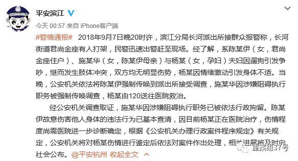 杭州警方通报,7日晚8时许,滨江分局长河派出所接报警称,长河街道君尚金座有人打架。经了解,陈某伊(女,君尚金座住户)、施某华(女,陈某伊母亲)与杨某(女,孕妇)夫妇因遛狗引发争吵,继而发生肢体冲突,双方均无明显伤势,杨某因情绪激动引发身体不适。当晚,公安机关将陈某伊强制传唤到派出所接受调查,施某华因涉嫌阻碍执行职务被强制传唤调查,杨某由120送往医院救治。