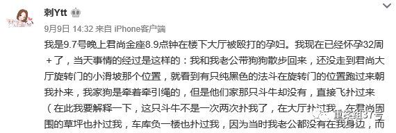 9日下午,微博名为@刺Ytt 的杨女士称,自己怀孕八个多月,7日晚在杭州君尚金座楼下大厅被殴打。据其描述,自己和丈夫带着狗散步回来时,一只没牵绳的纯黑色法斗犬飞扑过来,丈夫就用脚把狗推了一下,狗的主人“网红”陈某伊便与自己和老公发生争执。