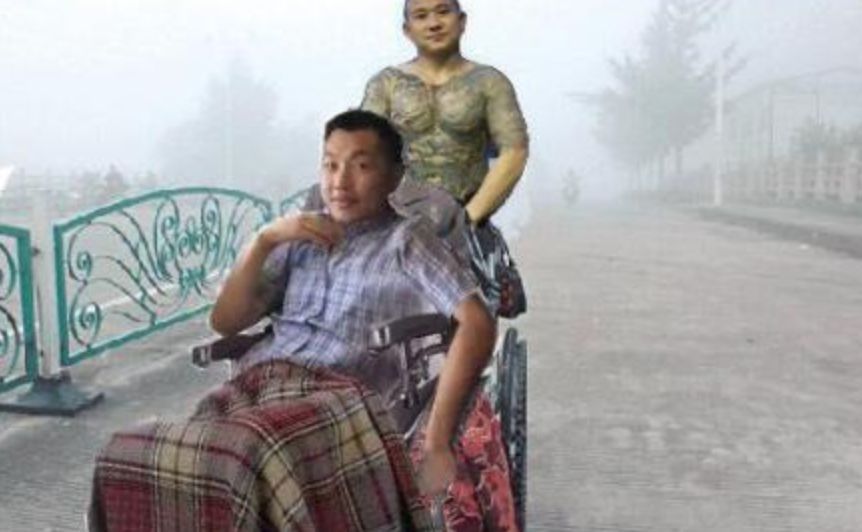 在视频中,他满脸笑容,坐着轮椅,赤裸上身,还让“龙哥”帮忙推车,并感谢滴滴。