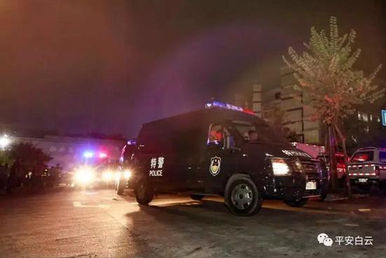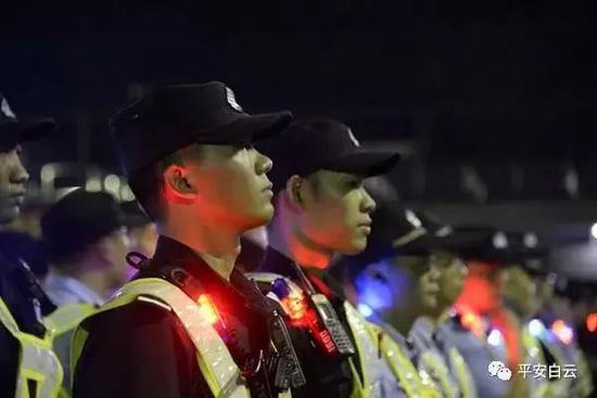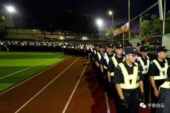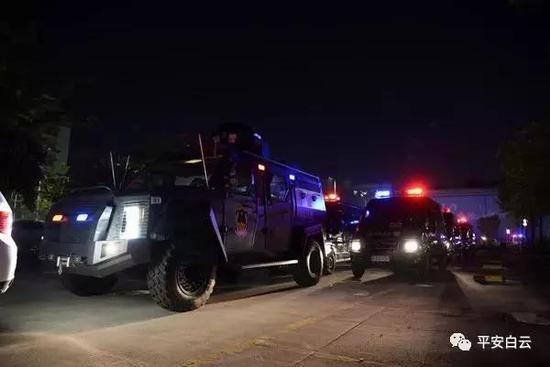 当晚21时,在白云区公安分局内部训练场,白云警方各警种整装待发,特警冲锋车、巡逻警车、运兵车均已就位。