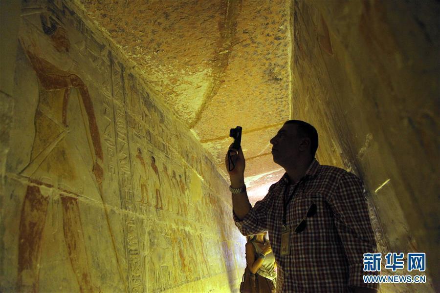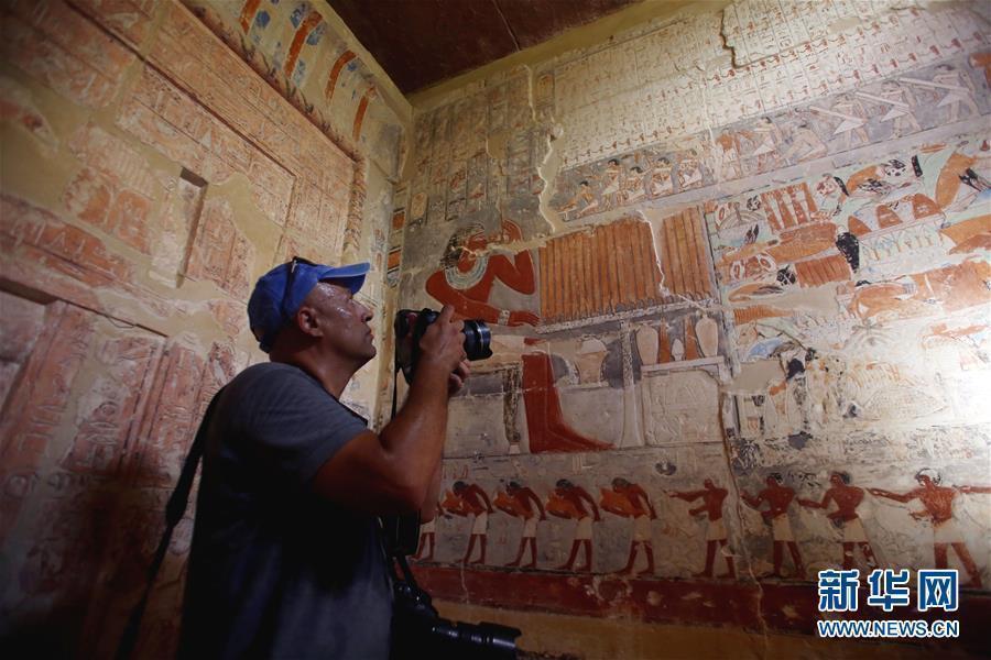 9月8日,在埃及吉萨省塞加拉地区,游客在古墓内拍摄 新华社 艾哈迈德·戈马/摄