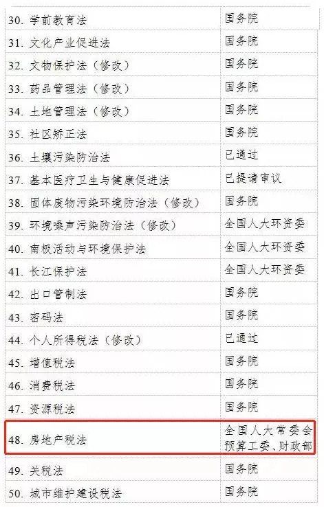 4月27日,全国人大常委会公布2018年立法工作计划,房地产税法被列为预备审议项目,视情在2018年或者以后年度安排审议。