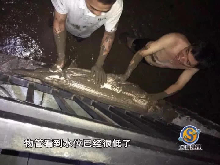 本以为搜捕行动很快就能结束,不料“水怪”竟然很狡猾,第一次挣脱渔网后一直游走在水下淤泥间,肉眼难寻其踪迹,工作人员只能浑水摸鱼。水掺杂着淤泥刚好没过膝盖,黄定耀两人搜索了四个多小时,在次日1时30分左右,终于在距离湖岸两三米的一个位置摸到一个“大家伙”。