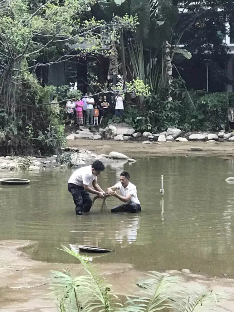 据他回忆,在12日21时中心湖水位降下来后,五名值班的工作人员开始搜捕行动,岸上三人用手电筒照亮湖面观察“水怪”动静,黄定耀和另一名同事穿上雨靴,撑起一张3米大网,下水搜捕。“之所以选在晚上捕捞,是因为手电筒强光下鱼很难藏身。”