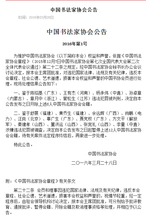 值得一提的是,热爱书法的官员落马,靳绥东并非第一个。  2016年3月,中国书法家协会发布公告,开除6名违法犯罪、损害协会声誉的会员会籍,对12名涉嫌违法犯罪被调查者暂停会籍。