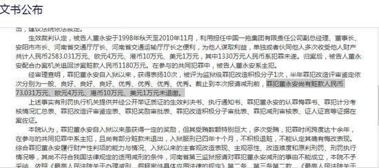 去年10月,河南省高院以不积极退赃,不能认定其确有悔改表现为由,驳回了董永安的减刑事由,裁定对其不予减刑。