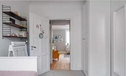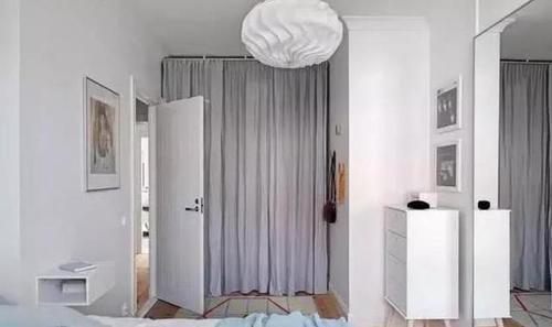 卧室里设置了一个步入式衣帽间,采用了布帘作为简单的遮挡,平时清理拆卸也非常方便。天花上悬挂了一盏白色吊灯,为这个空间增添了一丝浪漫的气息。