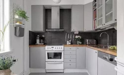 厨房采用了封闭式的设计,L型的橱柜布局留出了充足的活动空间。浅灰色橱柜搭配原木操作台面、黑色墙砖,显得简约大方。